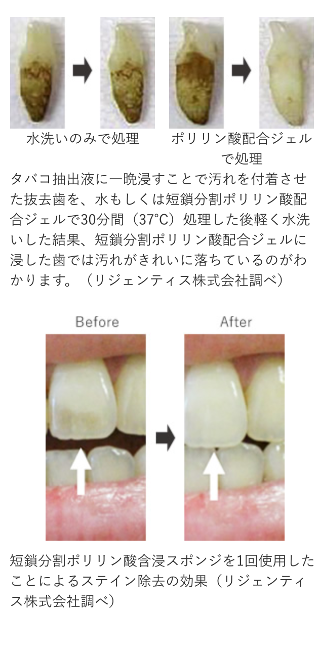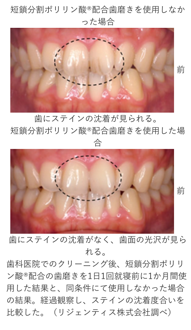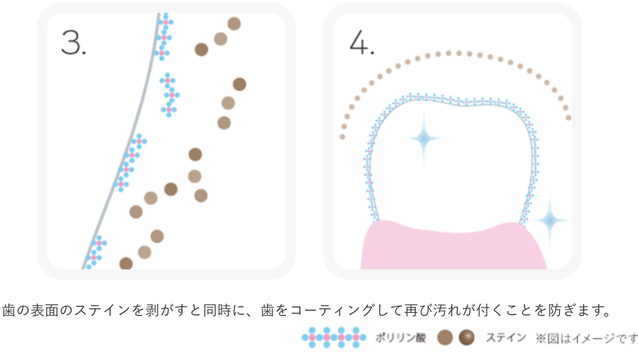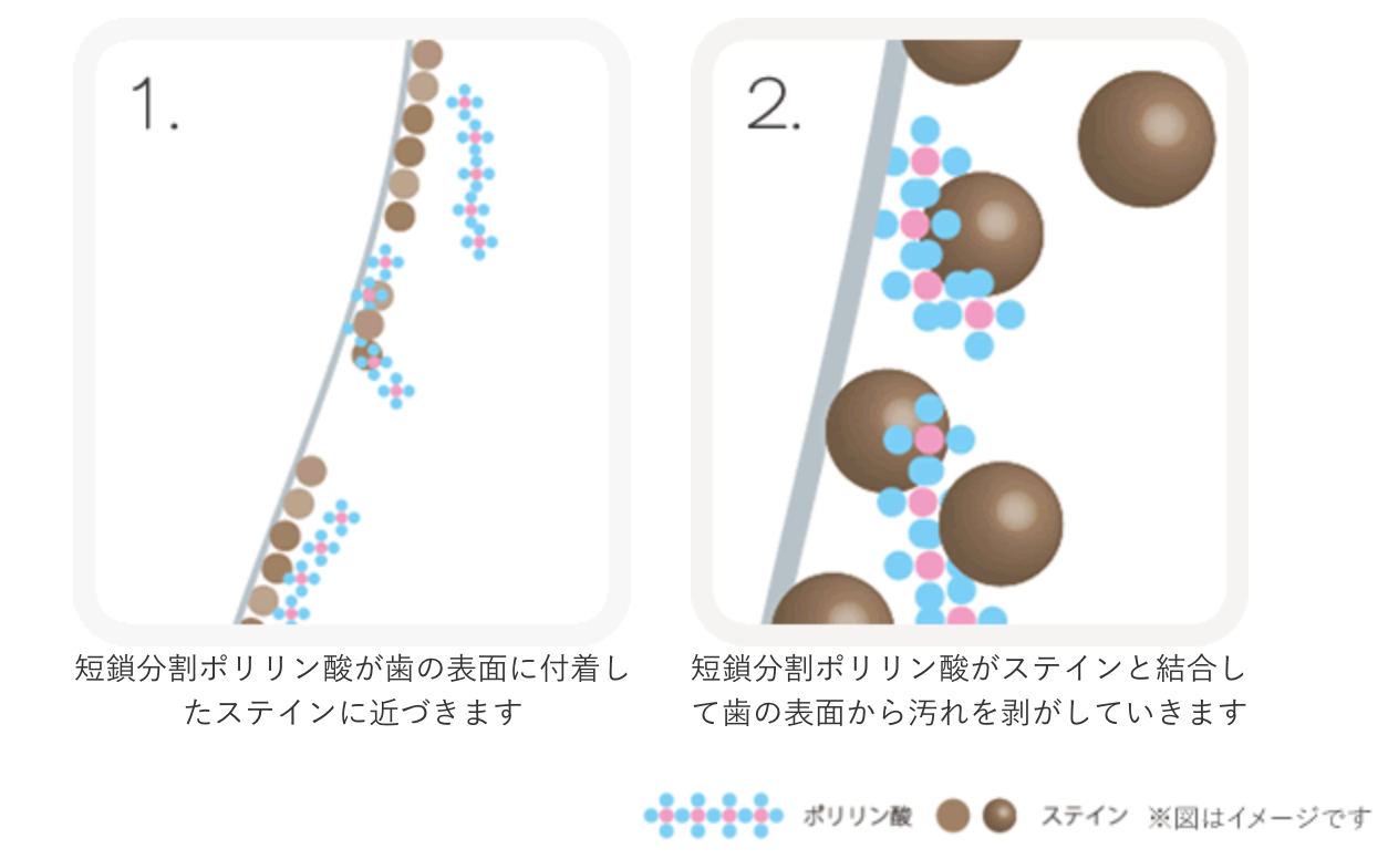 短鎖分割ポリリン酸®(約7〜15個のリン酸が結合した分子)には、歯の表面に付着した汚れ(ステイン)を効率的に除去する働きがあります。
