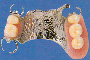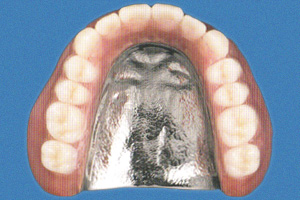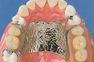 入れ歯には保険適用のレジン床(合成樹脂)と、自費の金属床があります。金属床はレジン床に比べて薄くて軽いので、お口の粘膜に吸着しやすく、下にも違和感が少ないという利点があります。また、熱の伝導にも敏感に反応しますので「熱い・冷たい」などの感覚がお口の粘膜に早く伝わり、豊かな味わいが得られます。