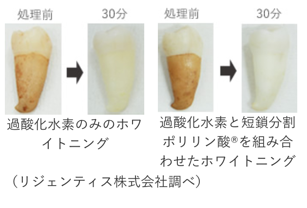 短鎖分割ポリリン酸®は、漂白効果を高める力も実証されています。歯科医院のホワイトニングで一般的に使われている過酸化水素(もしくは過酸化尿素)に短鎖分割ポリリン酸®を組み合わせることで、ホワイトニング効果が向上します。
