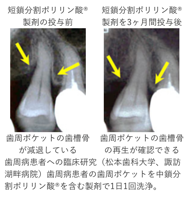 短鎖分割ポリリン酸®の組織再生促進機能を、歯周病治療に応用しようとする試みがあります。その中で歯周病患者を対象とした臨床研究(松本歯科大学、諏訪湖畔病院との共同研究)において、中鎖分割ポリリン酸®(平均60個のリン酸が結合した分子を含む)製剤を用いて歯周ポケットを洗浄した経験者で、症状の改善が見られました。